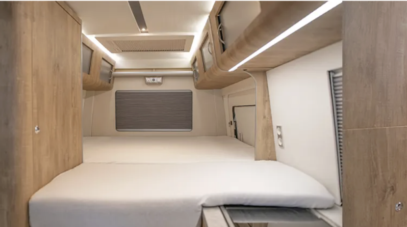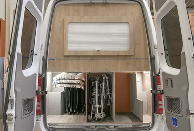 Onder het bed bevindt zich een ruime garage voor de grotere spullen. Er is zelfs gedacht aan de mogelijkheid tot het meenemen van twee elektrische vouwfietsen in de bus! U ziet het aan plaats geen gebrek/